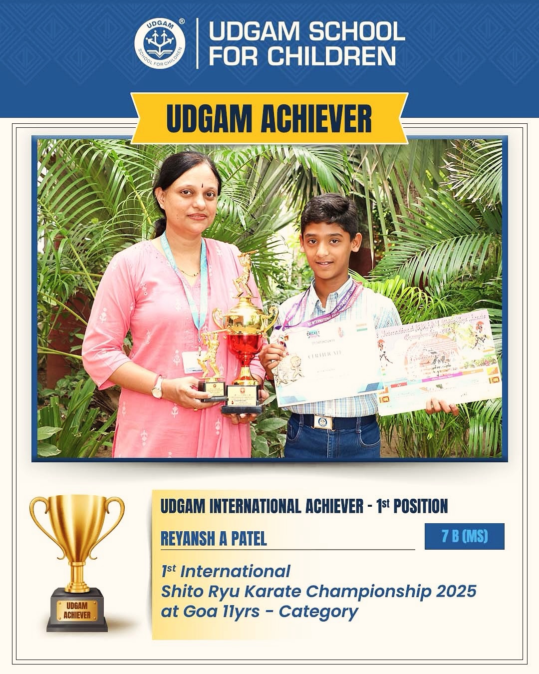 International Achiever from Udgam  Reyansh A Patel, 7B (MS), wins 1st position at Shito Ryu Karate Championship 2025...