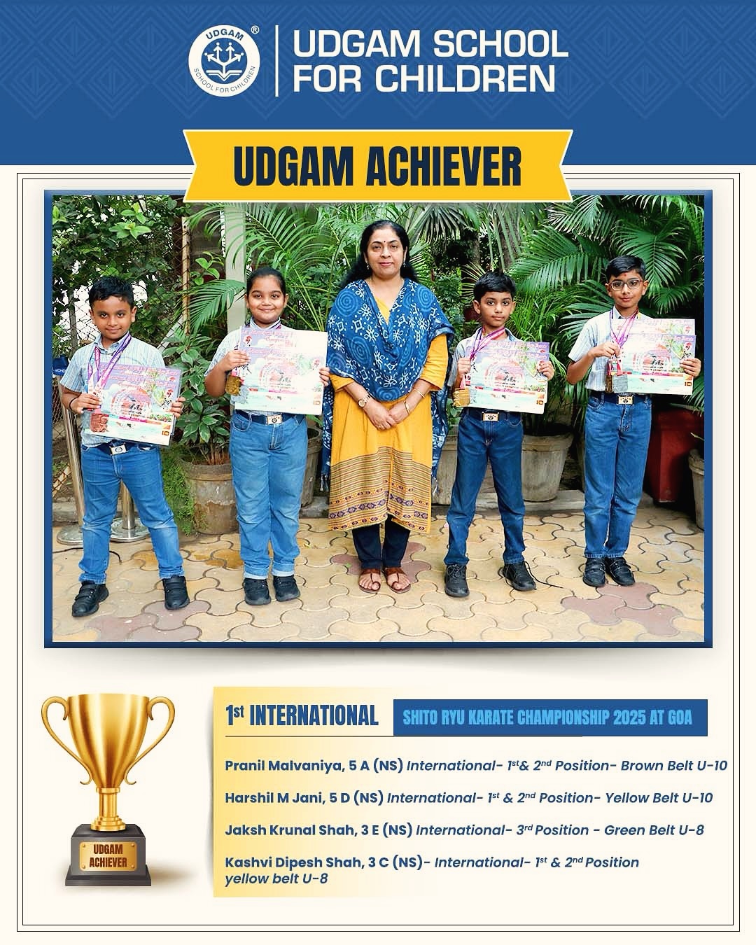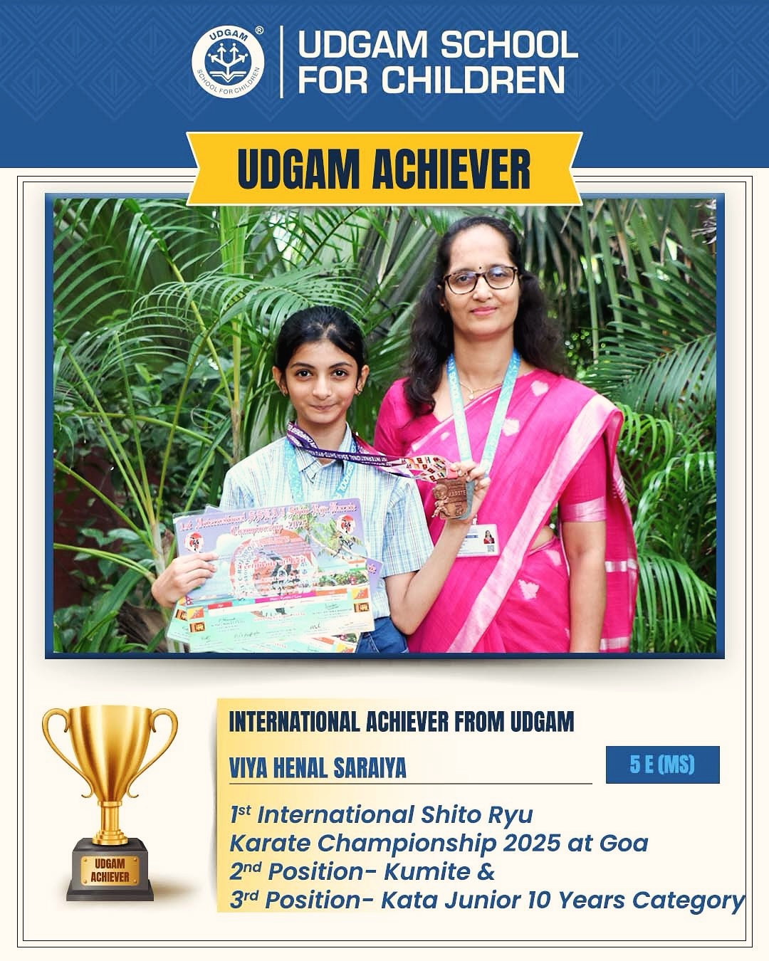 International Achiever at Udgam  Viya Henal Saraiya, 5E (MS), wins in Junior 10 Category.  1st position at Shito Ryu Karate Championship 2025  ...